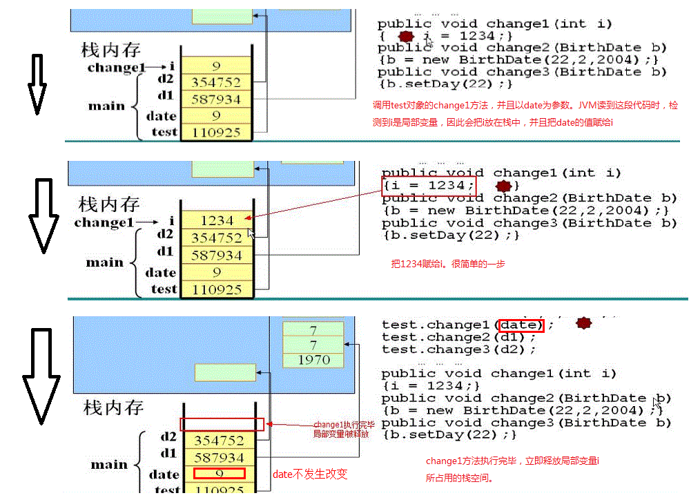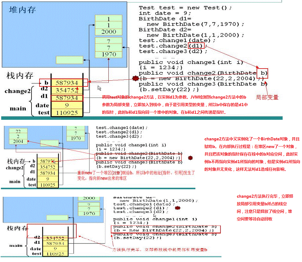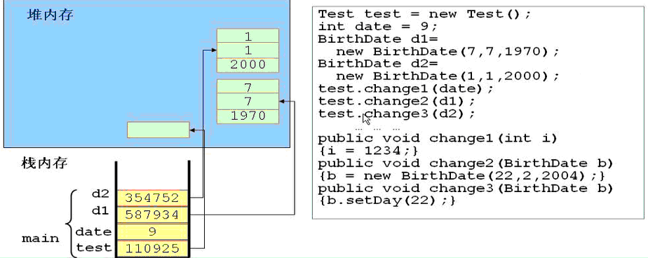 3.创建两个BirthDate类的实例d1、d2,在栈中分别存放了对应的指针指向各自的对象。他们在实例化时调用了有参数的构造方法,因此对象中有自定义初始值